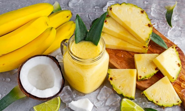 Na čtyři porce vezměte 300 g ananasu, 2 banány, jedno mango, 3 lžíce topinamburského sirupu, 120 g řeckého jogurtu, hrst mandlí a 300 ml vody (můžete použít kokosovou vodu).